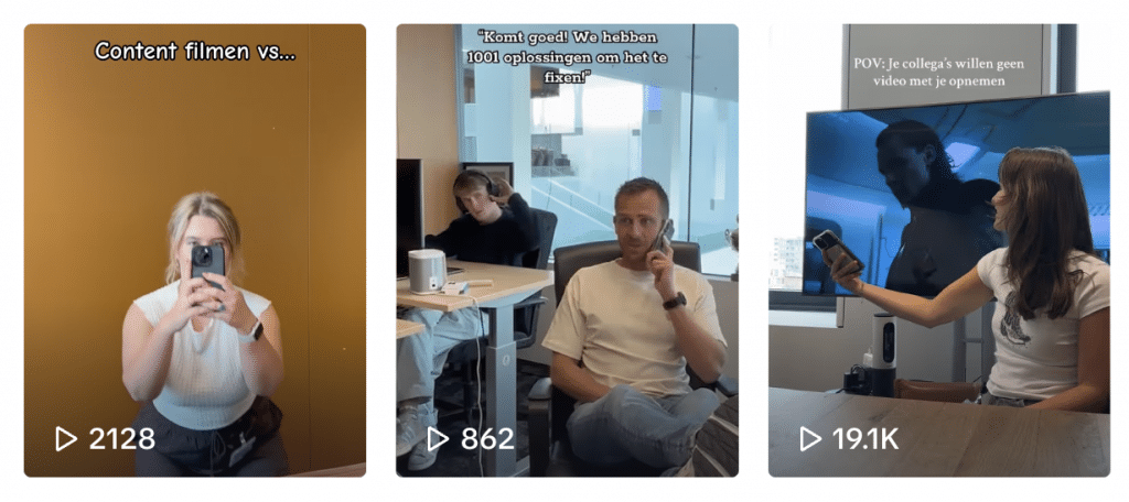 Het argument “we hebben geen tijd of materiaal” gaat vandaag de dag niet meer op. De meeste content gebeurt al, je moet het alleen vastleggen. Stimuleer teams om wekelijks iets te delen: een bijzonder moment, een spontane grap, een compliment van een cliënt of gewoon hoe hun dag eruitziet. Maak het makkelijk: werk met vaste formats of een eenvoudige appgroep waarin foto’s gedeeld worden.