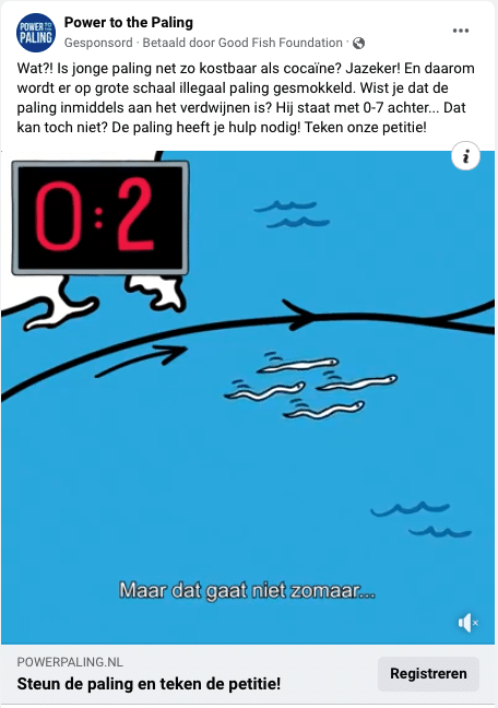De online campagne bestond uit verschillende fases. In de brandingfase zetten we het palingprobleem stevig op de kaart. We toetsten hierbij verschillende media – Google Display, YouTube, Facebook, Instagram en LinkedIn – en maakten binnen ieder medium onderscheid tussen doelgroepen, advertenties en content. Door actief te werken met verschillende samenstellingen ontdekten we welke mix van social media en search zorgde voor de hoogste betrokkenheid tegen de laagste kosten.